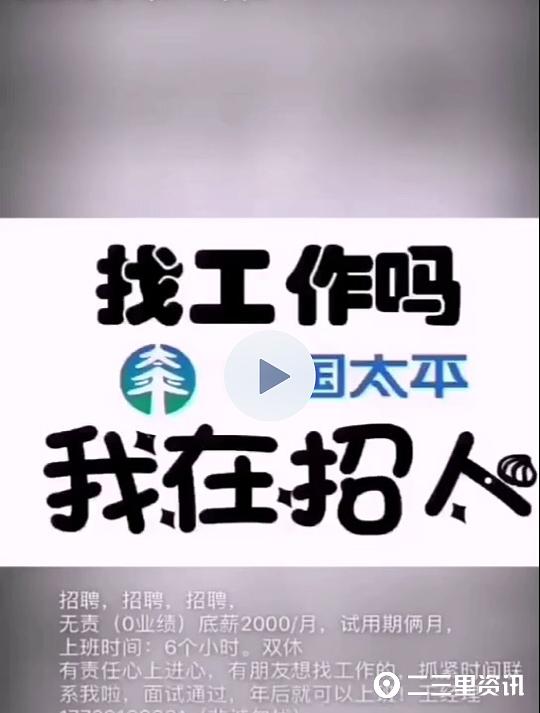 4月17日,赵先生向华商报提供了一份太平人寿的视频广告。文案写明:无责任(0绩效)底薪每月2000元,试用期两个月。工作时间为6小时周末,招聘联系人电话也附后。视频广告的一个插画也宣称:5G计划,4000元津贴,不用业务考核,培训就够了。