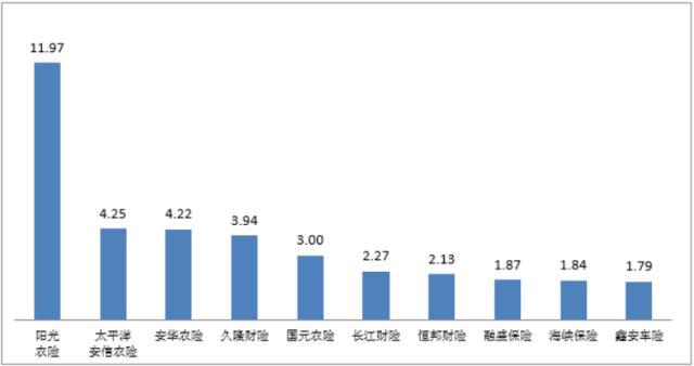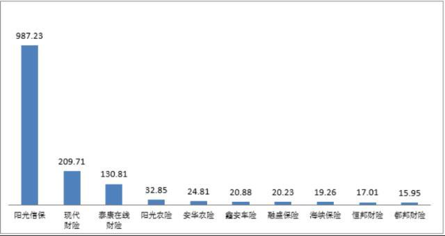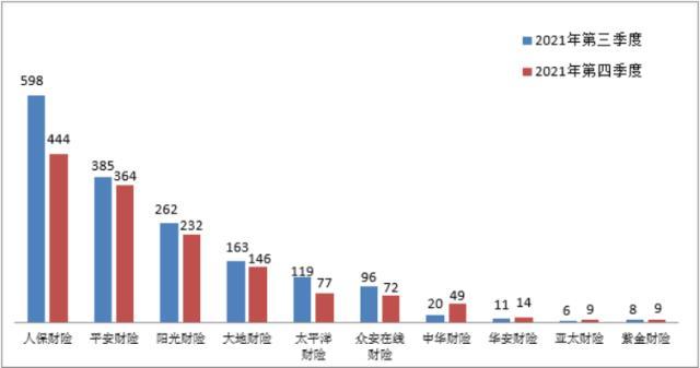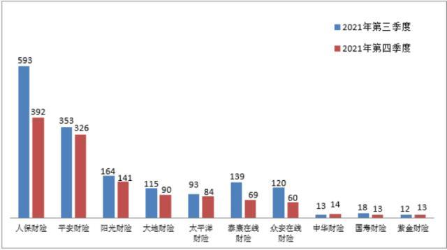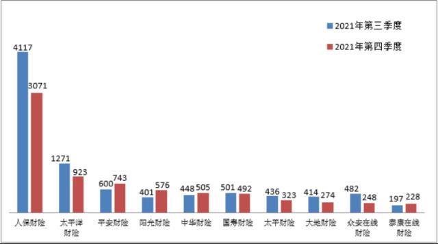 1。阳光信保、现代财险、泰康在线财险位列亿元保费投诉量前三的财险公司。【/S2/】2021年第四季度,财险公司亿元保费投诉量中位数为7.01件/亿元。其中亿元保费投诉量前10名分别是:阳光信保987.23件/亿元;现代财险209.71件/亿元;泰康在线财险130.81件/亿元;阳光农业保险32.85件/亿元;安华农业保险24.81件/亿元;鑫车险20.88件/亿元;盛保险20.23件/亿元;海峡保险19.26件/亿元;恒邦财险17.01件/亿元;都邦财险15.95件/亿元。