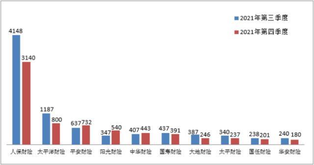 2。阳光农险、太平洋安心农险、安华农险万份保单投诉量位列财险公司前三。2021年第四季度财险公司万份保单投诉量中位数为0.47/万。其中,万份保单投诉量前10名分别是:阳光农险11.97/万份;太平洋安心农业保险4.25件/万件;安华农险4.22件/万件;九龙财险3.94件/万件;国家农业保险3.00件/万件;长江财险2.27件/万件;恒邦财险2.13件/万件;盛保险1.87件/万件;渠道险1.84件/万件;鑫车险1.79块/万块。