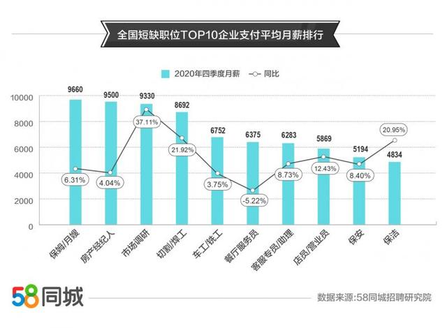 近日,人力资源和社会保障部发布了2020年第四季度100个职业排名,包括销售员、清洁工、保安。58同城招聘研究院大数据显示,2020年第四季度,全国紧缺10大岗位招聘需求同比增长,其中切割、焊工岗位招聘需求同比增长最快;全国紧缺岗位前10名的劳动者薪酬普遍上涨,其中保姆和月嫂平均月薪最高,为9660元。