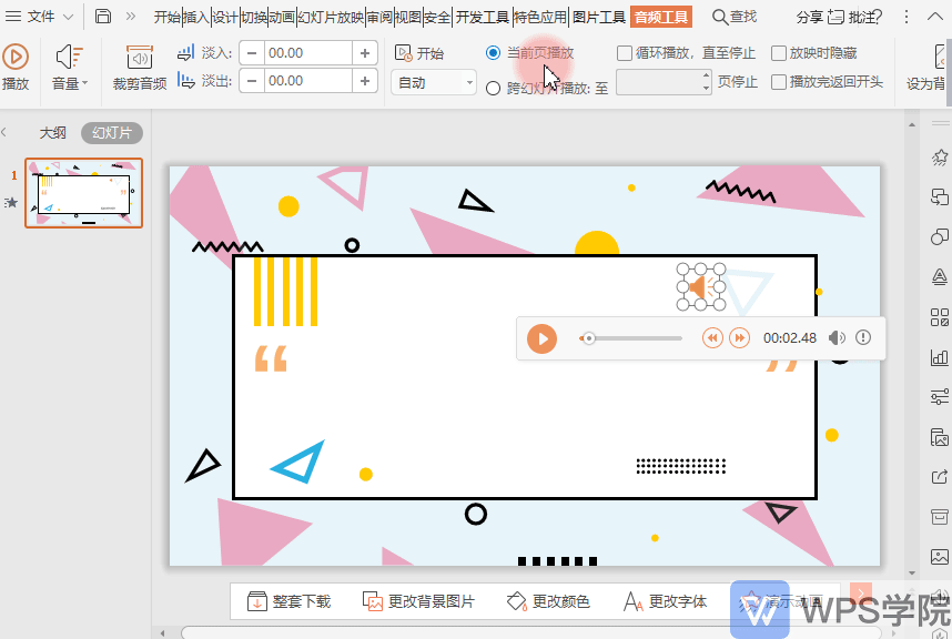 设置音频文件后,单击“播放”在幻灯片放映时播放音频。