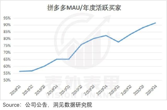 同时,拼多多MAU/年活跃买家曲线呈上升趋势,2020Q4超过90%。这体现了拼多多不断扩大的SKU,真正满足了更多用户的需求。