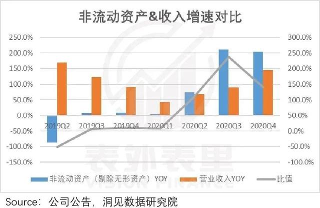 财报数据显示,2020年下半年,拼多多非流动资产增速明显高于营收增速。一般情况下,企业的收入或GMV与非流动资产在会计上是有一定匹配的。
