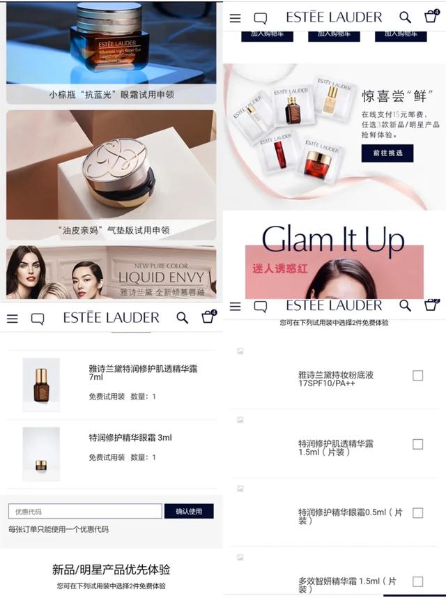 在雅诗兰黛官网购买任何一款产品,都会得到三个样品。购买金额越大,获得的样品越多。老客户购买,进入nccr1,免费赠送7ml小棕瓶精华。并且会经常推出邮资已付的试用活动。您可以选择三个样品,邮费15元。