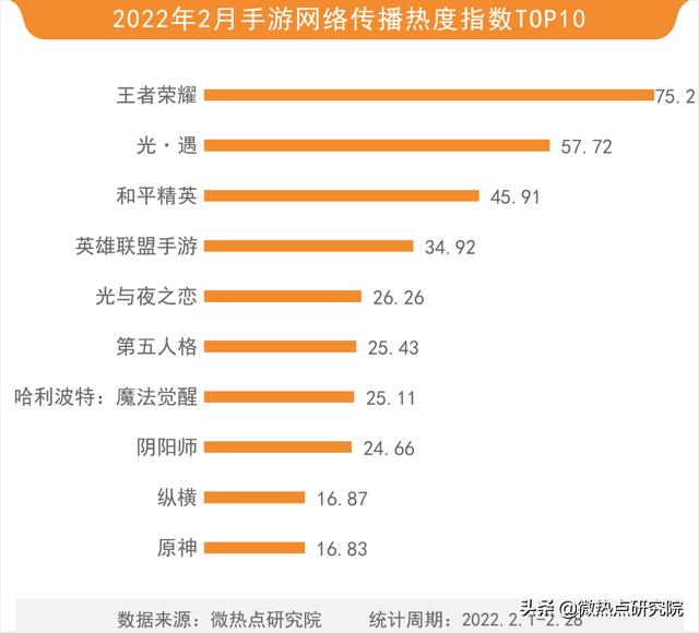 根据微热点研究院的数据,2022年2月,腾讯旗下的MOBA手游《王者荣耀》依然是最受大众关注的游戏,以75.2的人气指数位居手游榜榜首。2月,为了庆祝冬奥会在王者荣耀推出全新限时游戏——冰雪奔跑模式,诸葛亮荣耀收集皮肤遭到网友抵制,王者荣耀联合飞车手游上线新皮肤,葛源皮肤设计大赛,都引起了广泛的关注和讨论,助推了王者荣耀的知名度。