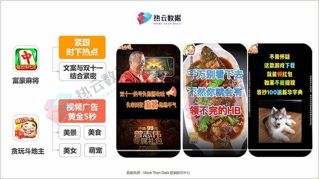 在素材内容上,两款手游各有特色。《富豪麻将》紧跟当下热点,素材与双十一紧密结合。但“打地主”遵循广告的“黄金5秒”法则,在视频前5秒抓住用户眼球。从媒体平台的角度来说,前5秒留住用户,意味着你可以进入更大的流量池,获得更多的曝光;从效果监测指标来看,视频广告的播放率起着重要作用。热云数据注意到,在《玩地主》中,美景、美食、美女、可爱的宠物都集中在视频的前五秒。