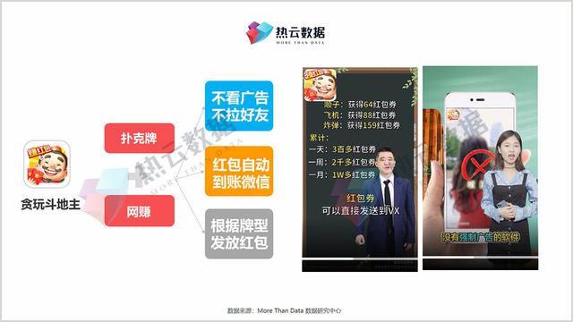 而《打地主》最大的不同在于它结合了扑克牌和线上赚钱模式。微信除了红包自动到账,不用看广告,不用加好友,特点是按卡牌类型发红包,炸弹、飞机、王者炸弹、顺子、三带、二等,领的红包金额不一样。