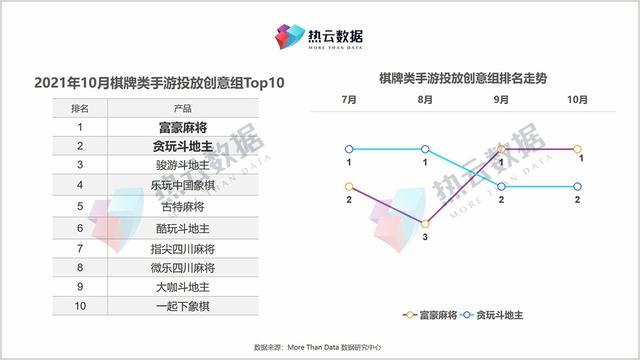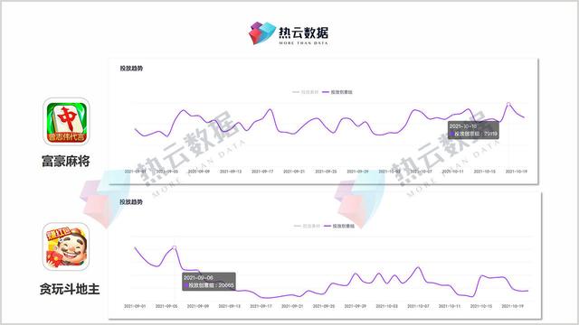 棋牌文化在中国有着广泛的群众基础和较高的知名度。移动互联网普及后,棋牌手游的发展势头越来越大。从2021年10月上线的棋牌手游Top10创意组来看,在众多棋牌类型中,麻将、斗地主、棋牌是大买家,呈现三足鼎立的格局。其中“富人麻将”和“斗地主”最好,排名第一或第二。通过观察近几个月热云数据的排名走势,发现上述两款手游的表现可谓你来我往,热闹非凡。7、8月,《玩斗地主》购买量排名第一,《富豪麻将》保持前三。9、10月,《富豪麻将》后来居上,登顶榜首。本文将具体分析“富豪麻将”和“斗地主”的购买量。
