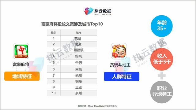 热云数据对《富豪麻将》和《玩斗地主》的文案进行分析,发现两款手游对自己的用户群体都有明确的定位,只是侧重点不同。“富豪麻将”的文案侧重于地区和城市,而“玩地主”侧重于人群特征由于麻将文化的地域属性较强,富豪麻将针对安徽、江西、浙江、海南等省的3-5线城市,而爱地主则针对年龄较大、收入较低、不稳定的玩家。