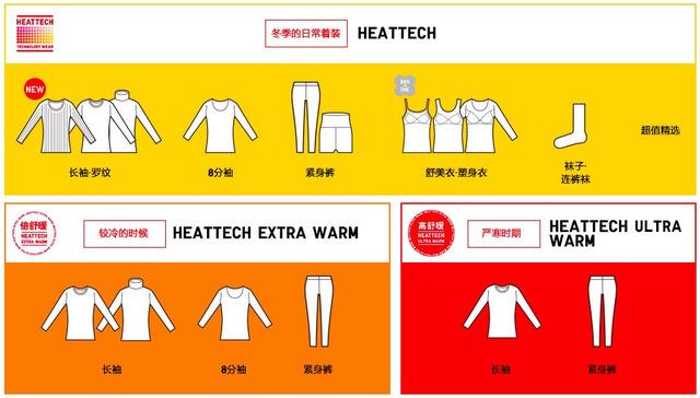 HEATTECH分为三级抗寒。比如在广东穿HEATTECH是可以的,但是更冷的北方需要HEATTECH超暖,零下几十度就会是HEATTECH超暖。