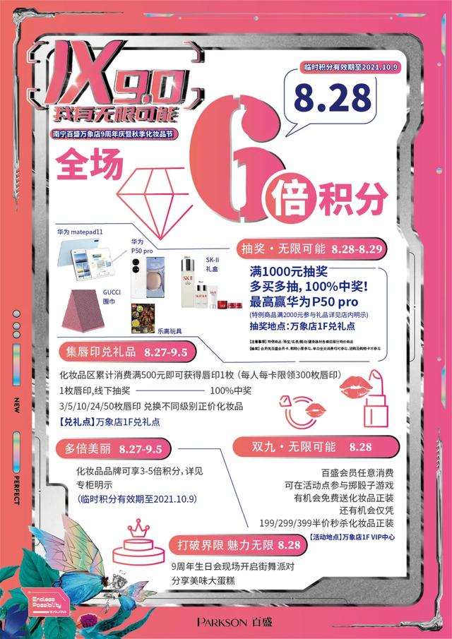 抽奖地点:南宁百盛A厅中庭3F/南宁百盛B厅客服中心4楼/南宁百盛万象店兑换点1楼