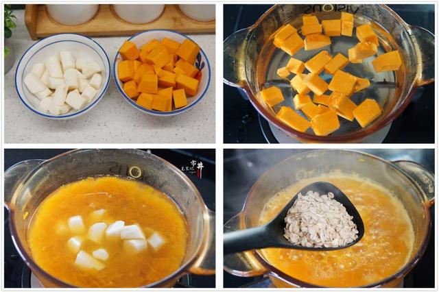 4.根据自己的喜好,加入适量的燕麦片,煮1分钟左右,然后关火,一锅色泽金黄,诱人食欲的南瓜山药燕麦片就做好了。