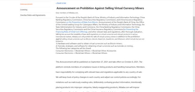 公告称,根据相关法律法规的规定,以及国际市场虚拟货币及虚拟货币相关产品法律法规的不稳定性,经平台评估,平台将禁止商家销售虚拟货币矿机产品,包括但不限于:1。在禁止出售比特币、莱特币、生物币、贵格币、以太币等虚拟货币的基础上,用于获取相关虚拟货币的比特币矿机等硬件和软件;2.获取虚拟货币的教程,策略,软件,比如挖矿教程。该公告将于2021年10月8日生效。
