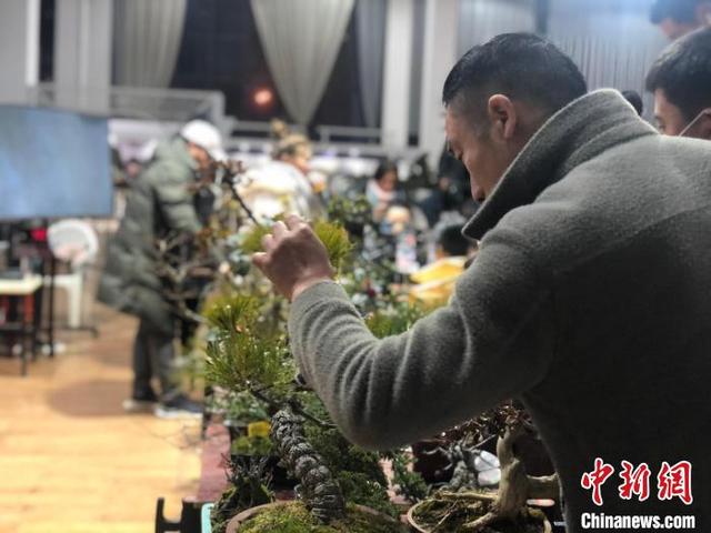 花农们小心翼翼地管理着将要在舞台上拍卖的盆景。刘玲摄