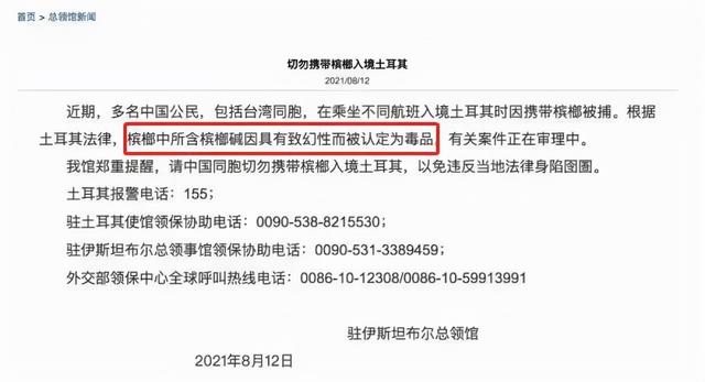 8月12日,官网,中国驻伊斯坦布尔总领馆提醒:“中国同胞不允许携带槟榔进入土耳其。根据土耳其法律,槟榔中的槟榔碱因具有致幻作用而被视为毒品。”