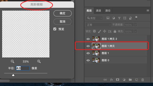 2.我们选择中间层,然后执行高斯模糊操作。模糊程度根据衣服的褶皱来定义,也可以根据身材来设置。
