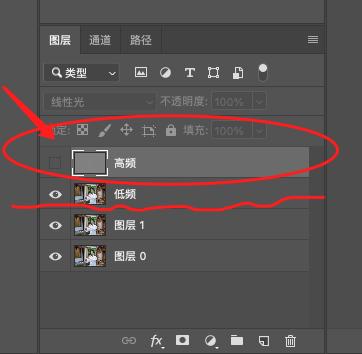 4.此时,构建一个简单的高低频层。接下来,我们首先关闭高频层的小眼睛,选择低频层-然后我们选择混合笔刷-笔刷设置为