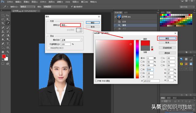 这时,你可以看到身份证照片的背景颜色已经变成红色。保存好身份证照片就行了。你可以根据这个方法改变任何颜色。