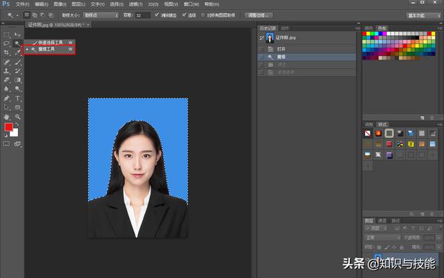 首先在PS中打开证件照,在左侧工具栏选择【魔杖工具】,然后点击图片,这时就可以看到一圈虚线。