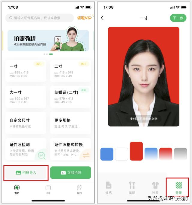 打开软件,直接点击【相册导入】。上传身份证照片后,在【背景】界面选择需要的颜色。