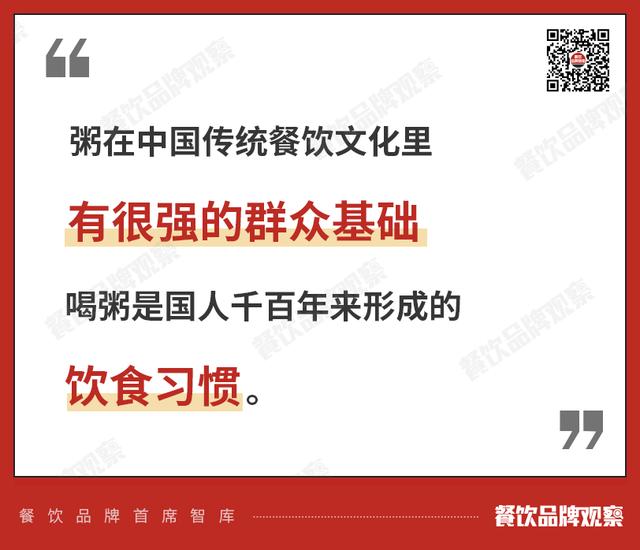 粥在中国传统饮食文化中有着强大的群众基础。吃粥是中国人几千年来形成的饮食习惯。无论南北,男女老少都爱喝粥。能被中国人从古到今都吃到,而且百吃不厌,说明它是一个被消费者普遍接受的品类,所以几乎不需要市场教育。