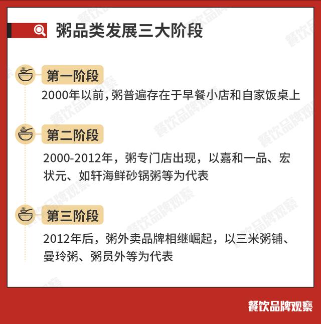 2010年后,潮汕砂锅粥开始北上,弥补了北方高端海鲜粥的空不足。随后,潮州汇、霍奇等潮汕砂锅粥品牌走出市场。2014年后,随着外卖平台的兴起,粥品类中涌现出几个黑马品牌,如三米粥铺、满岭粥、粥侍者等。