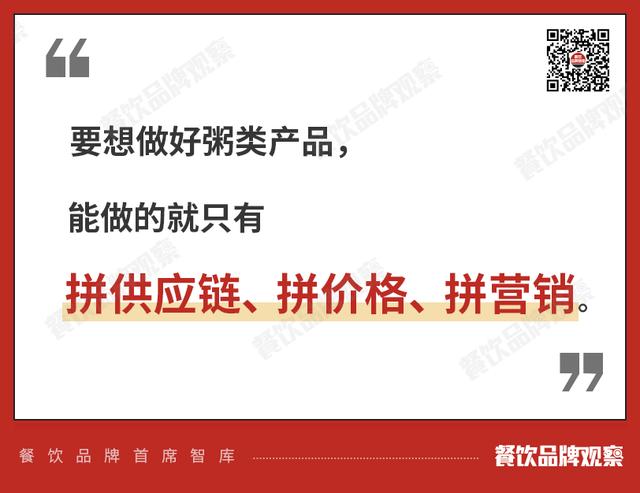所以要想做好粥类产品,只能拼供应链,拼价格,拼营销。但对于很多小餐饮店来说,供应链和营销水平还远远不够强大,仅靠价格竞争很容易陷入恶性竞争。一位粥店老板痛心地说,在用户眼里,这个牌子的粥和另一个牌子的根本没有区别,谁的价格低,谁就点谁的。不打价格战,量根本上不去。