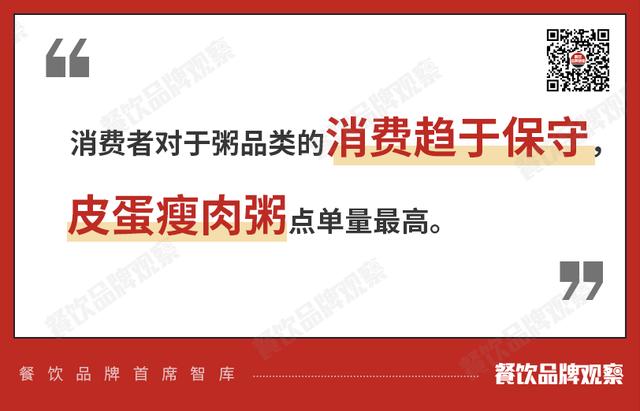 君观察了外卖平台上各大品牌的点餐率后发现,皮蛋瘦肉粥是点餐量最高的。可见消费者在粥的消费上趋于保守,经典产品不容易过时。