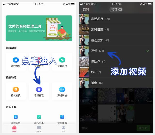 要从视频中提取音频,先把视频保存到手机上,然后用音频编辑转换器打开,找到音频提取功能。点击进入手机相册,查找保存的视频。