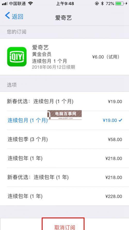 4.最后会看到爱奇艺订阅页面,点击底部的【退订】,这才是取消自动续费的正确做法,如下图所示。