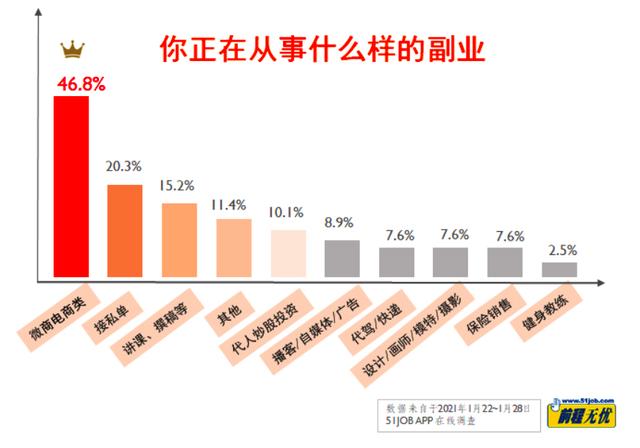 拥有更多的个人时间是从事副业的首要前提。从事副业的受访者中,近一半(46.8%)从事的是微信业务、代购、网店等与受访者正式工作没有直接关系的电子商务工作。这种副业门槛较低,对年龄和专业没有要求,但更依赖人脉和沟通,女性员工数量是男性员工的3倍以上。