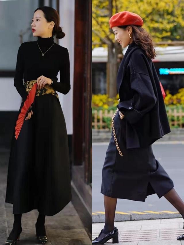 尤其是黑色长款大衣、黑色打底衫、黑色短裙或黑色高跟鞋,40岁的女性可以用它们打造高级又实用的搭配。