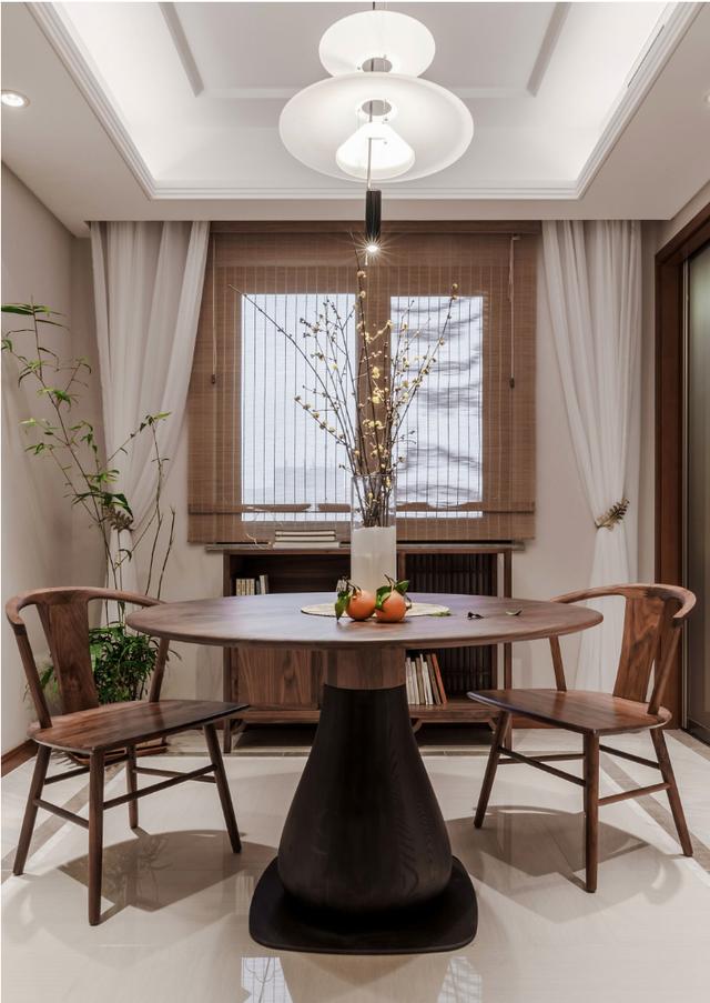 亮点五:餐厅与瓷砖地面相连。为了更好的营造中国风,整个房间空也有呼应感。餐桌和餐边柜采用温暖的黑胡桃木,用竹帘阻隔铝合金窗带来的工业气息,两侧白沙对称,餐厅的主灯相互搭配。