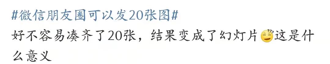 1月27日,#微信朋友圈可发20张图片#登微博热搜第一。据悉,日前,微信分别发布了Android版8.0.19和iOS版8.0.18。这次更新,朋友圈可以发布的图片数量上限从9张变成了20张。