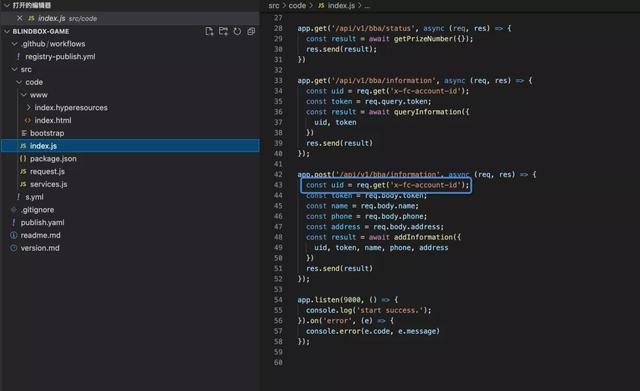 4.用户点击抽奖操作后,会在用户账号下发起对无服务器服务的请求,无服务器服务会根据用户的uid信息处理相关信息,向本次活动的后台无服务器服务发起真实的抽奖请求;