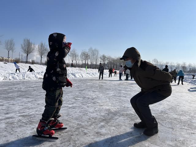 “别摇,蹲一会儿,蹲在原地”,一个老人数着。他7岁的孙女穿着溜冰鞋,双手背在身后,身体与冰面平行。