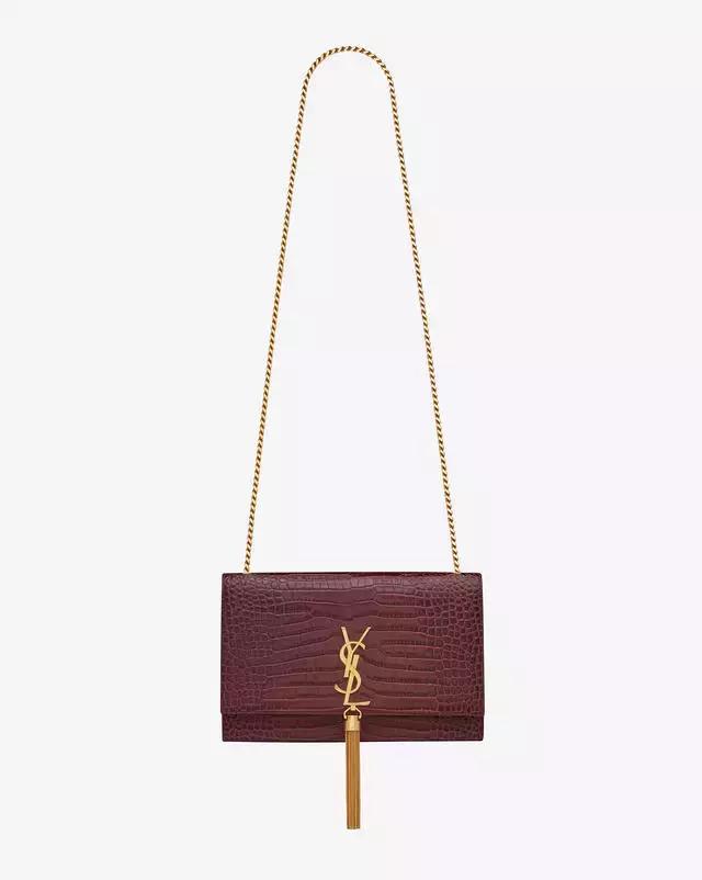 圣罗兰流苏挎包的特点是在原有基础上加入了流苏元素。材质有四种:光面小牛皮、鳄鱼皮压花、蟒蛇皮压花、天鹅绒。有两种尺寸:中号和小号。流苏和字母组合还有金色和银色可选。