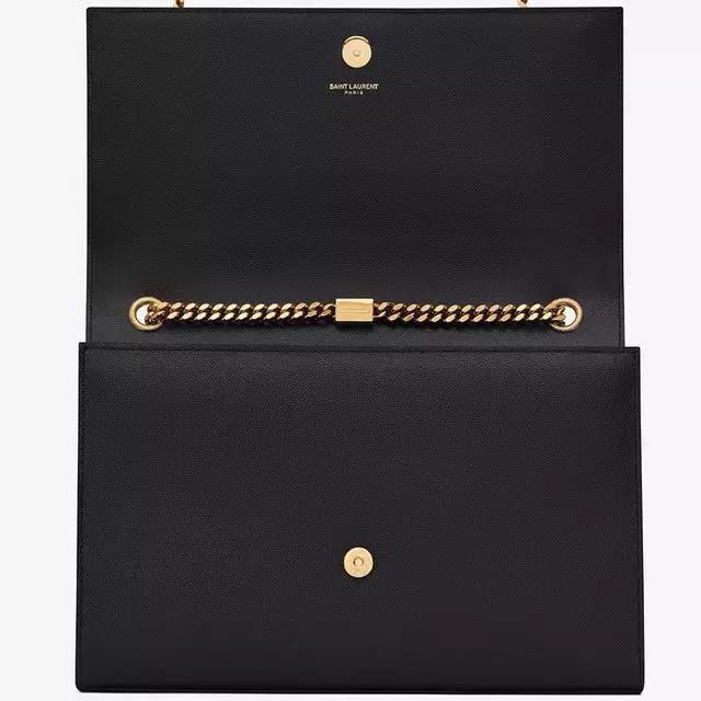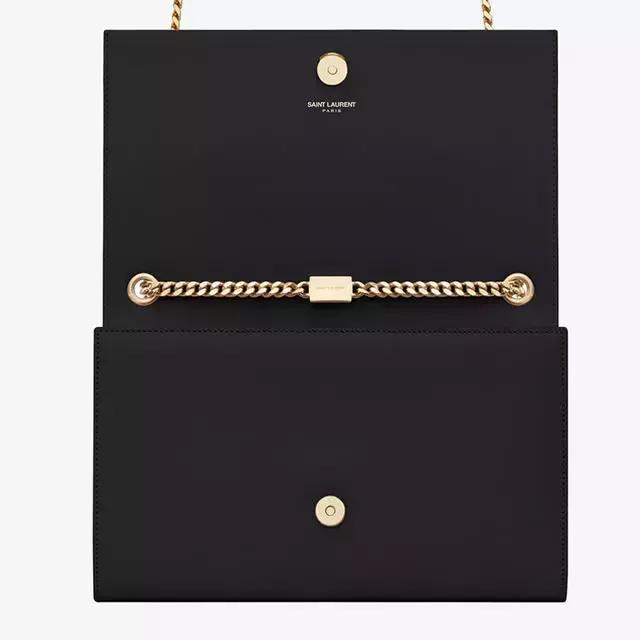 包包由金属四合扣开合,包口盖内有明显的圣罗兰烫金字样。