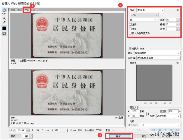 第二步,点击预设选择质量为10的JPEG low ,选择优化,这样我们的参数就设置好了。