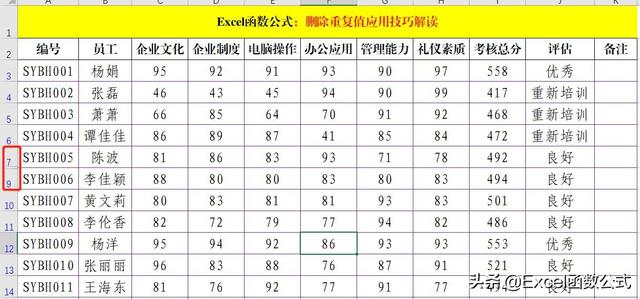 选择工作表中的任意单元格区域,数据-删除重复值,打开删除重复值对话框,单击取消全选,选择列中的数字和员工,然后单击确定。