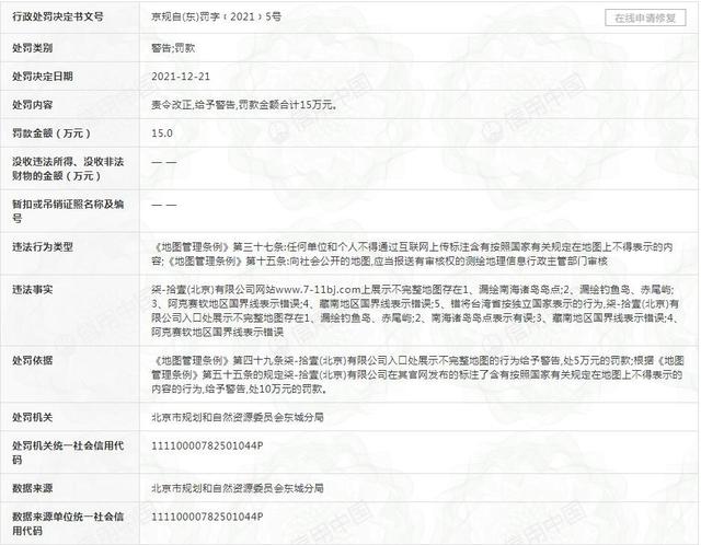 据央视新闻等媒体7日报道,信用中国网站发布的消息显示齐视易(北京)有限公司因使用不完整地图被北京市有关部门警告并罚款15万元。处罚决定书显示,该公司在官网使用并在公司出口处展示的地图存在诸多问题,包括赤尾屿、中国钓鱼岛未标绘,南海诸岛点标注错误,台湾省标注为“独立国家”,藏南与阿克赛钦的国界线均标注错误。