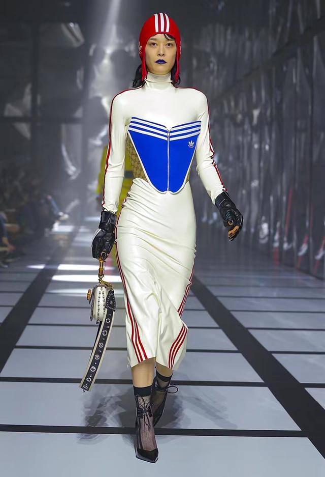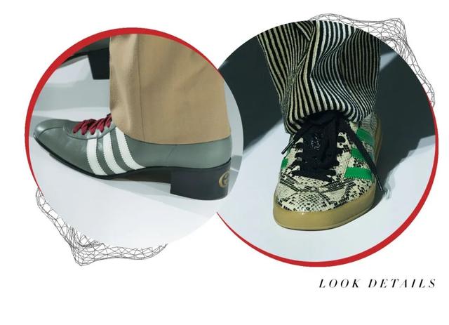 在联合品牌盛行的今天,跨界成为品牌打破自身风格,寻求突破的一个入口。在本季时装秀中,AdidasOriginals的经典三叶草与古驰的标志一同亮相。有意思的是,两者的标志性元素都有共同点,同样是条纹,所以融合在一起就相处的很好。
