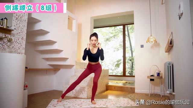 1.站立,呼气,屈膝,右脚踢向右侧。注意收腹和脊柱伸展。