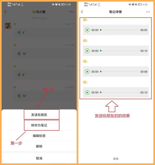 接下来打开微信收藏,可以看到语音会保存在这里。进入保存的语音后,点击右上角,先将语音保存为笔记,然后选择“发送给朋友”。