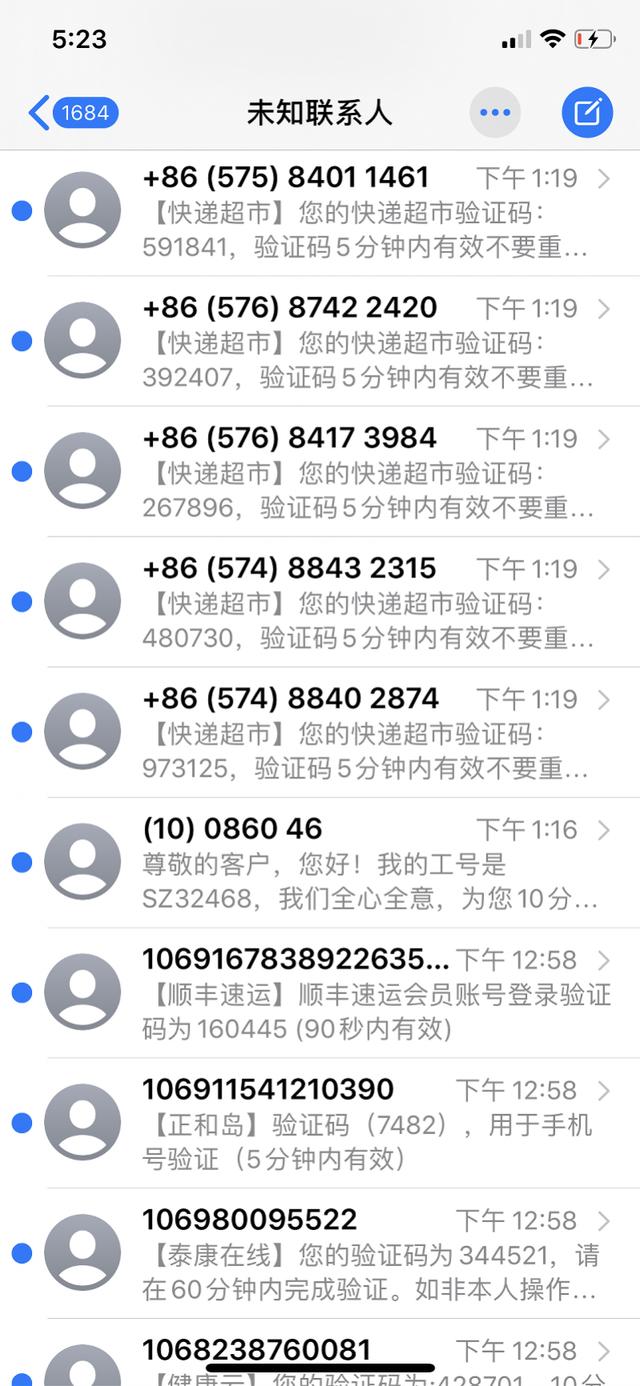 吴女士说,11月20日中午12点20分,她手机上突然收到大量关于验证码的短信。“各个平台的验证码短信突然蜂拥至手机,平均每秒一条,持续二十多分钟,短时间内收到上千条。”吴女士说,为了查明原因,她赶紧拨打了10086客服电话,工作人员解释说有业主反映过类似问题,但具体原因还不清楚,同时帮他们开通了骚扰短信的保护服务。“工作人员马上帮我打开了保护服务,但是各个平台的验证码短信还是源源不断,根本拦截不了。”