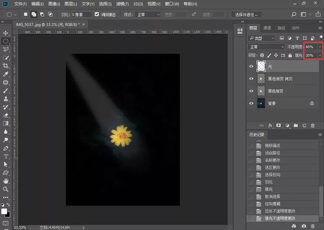 执行滤镜-模糊-径向模糊,数值设置为100,模糊方式选择缩放,中心模糊调整到左上角。调整灯光层的整体不透明度为80%,填充不透明度为20%。