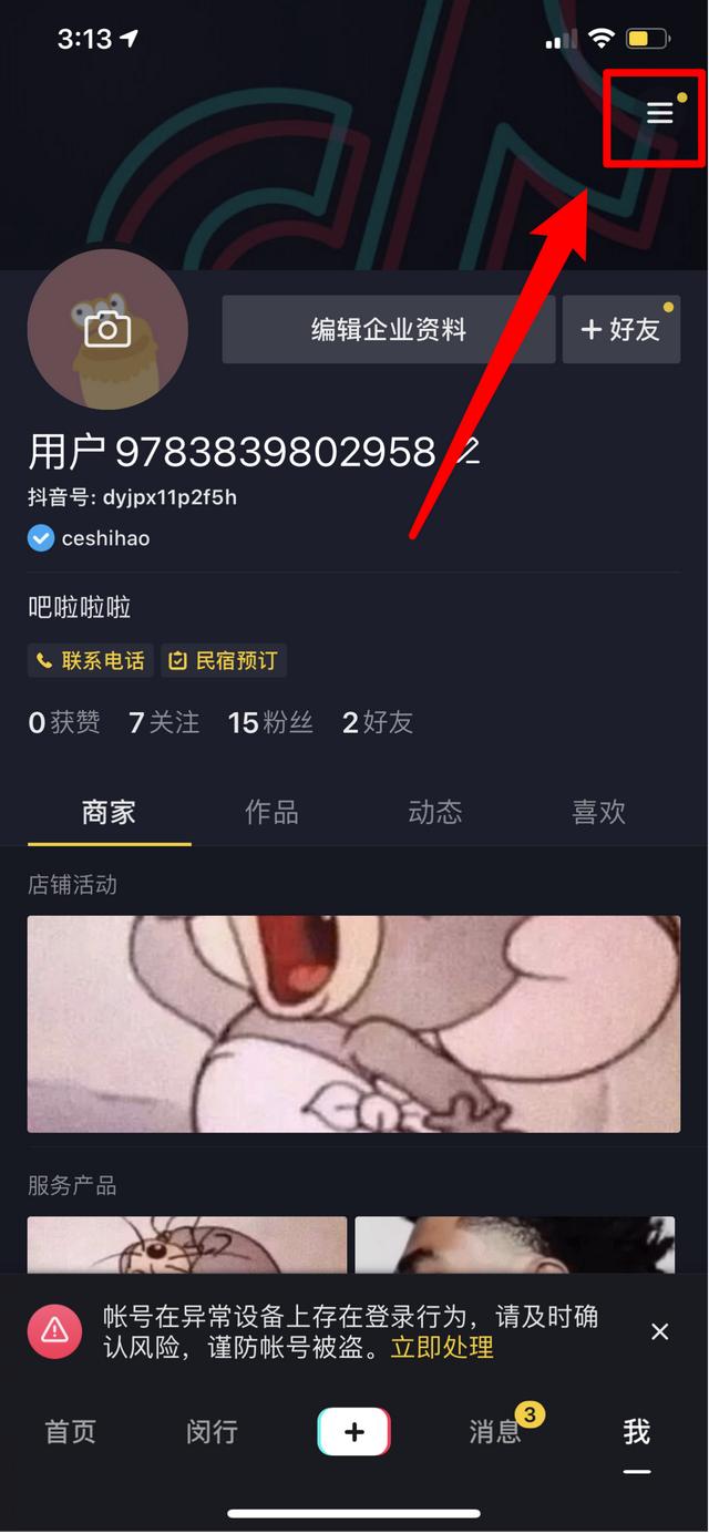 (1)打开Tik Tok App,登录企业,点击“我”,点击右上角的三个横标。