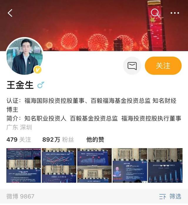 另一个微博账号“王金生”截至发稿已有892万粉丝,微博认证为“富海国际投资控股董事、百益富海基金投资总监、知名财经博主”。翻看发布的微博内容,一部分是豪华酒店餐厅的照片,一部分是所谓“专属交际圈”的截图。