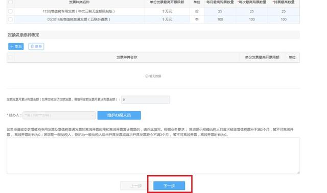 点击【添加】添加所需发票类型,点击【下一步】验证相关票种信息,确认后提交。