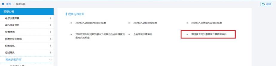申请增值税专用发票联的发票限额,进入电子税务局后点击【我要缴税】-【税务行政许可】-【增值税专用发票最高限额审批】。